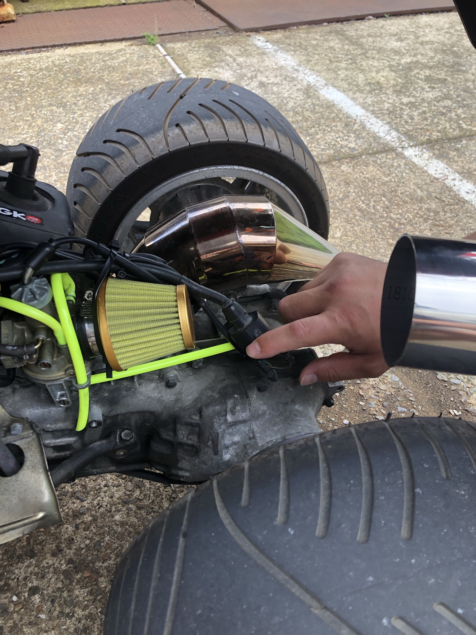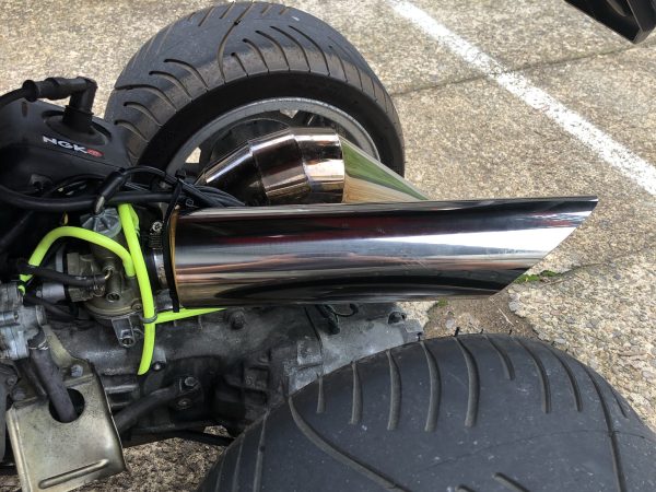 2021.11.05 HONDA ジャイロ - エアクリーナーカバー HONDAジャイロ用エアクリーナーカバーを制作しました エアクリーナーの収まるステンレス鏡面のパイプを斜切りにし、固定用ステーを溶接しています